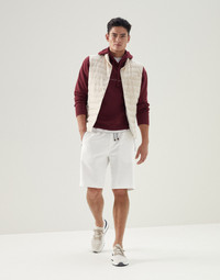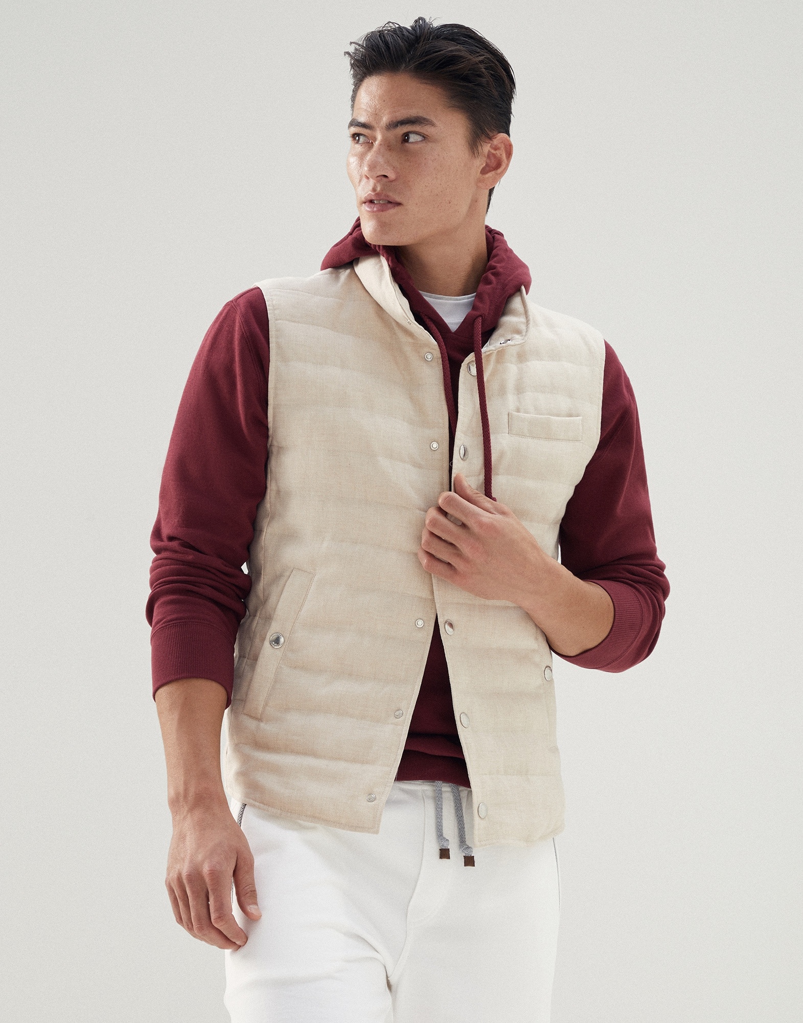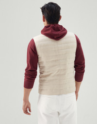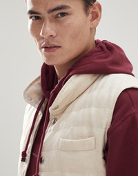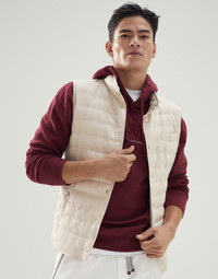 The classically sporty style of the down vest meets the refined appearance of wool and linen fabric, a fluid, slightly slubbed material. Lightweight and versatile, the garment is particularly designed for the transitional seasons, thanks to its weightless high-quality 20g goose down and feather padding. MATERIALS The linen and wool fabric is a very lightweight material that is cool and breathable. The texture is characterized by a dry hand, a slightly slubbed appearance and is wrinkle-resistant thanks to the twisted composition of the threads. The cupro lining provides added comfort. DETAILS Button closure Chest pocket Hand pockets with snap Water-resistant nylon lining Two interior pockets with button and pen holder 60% LINEN, 40% WOOL