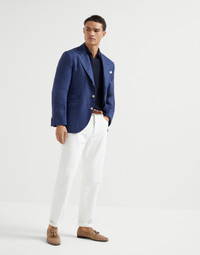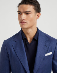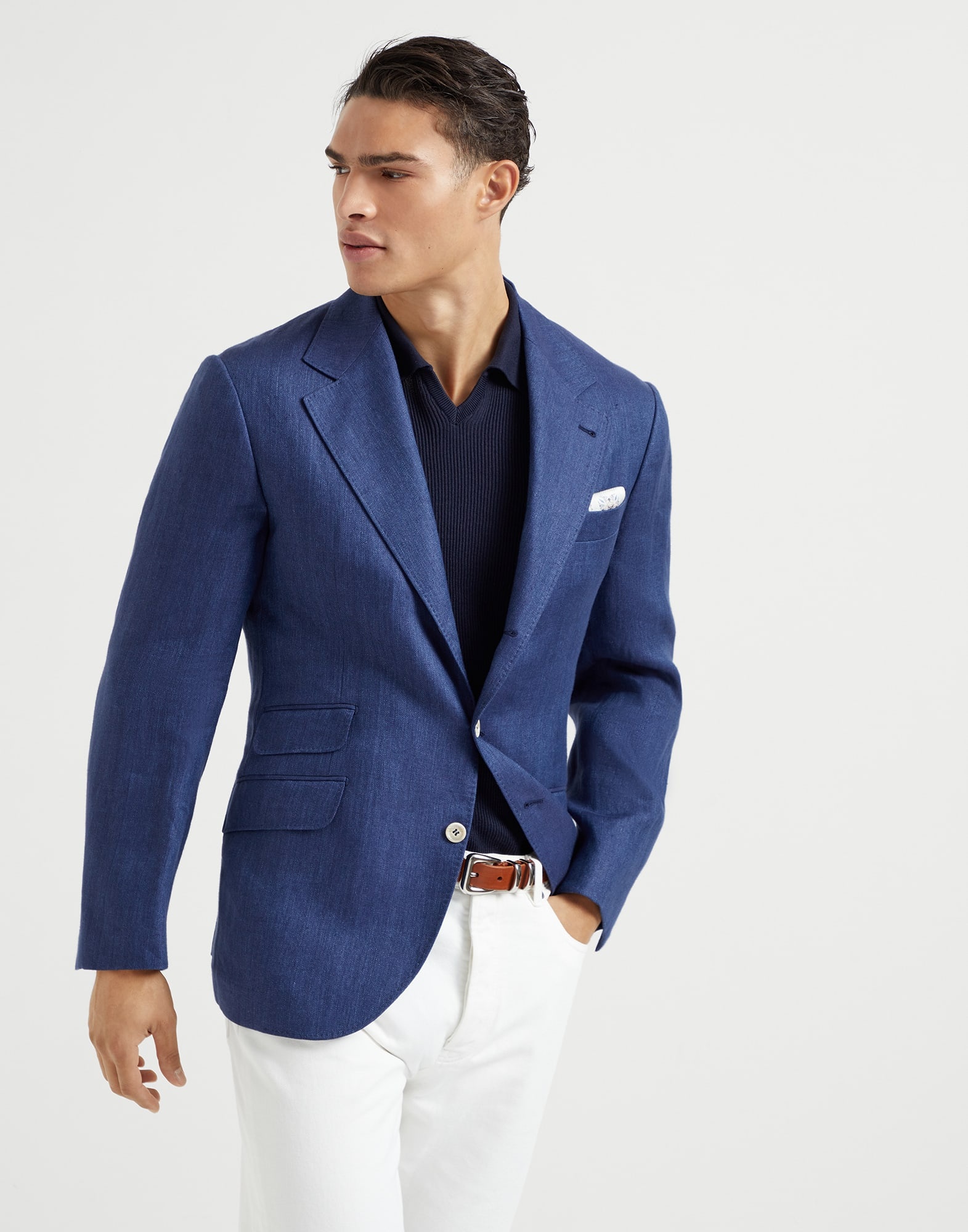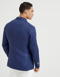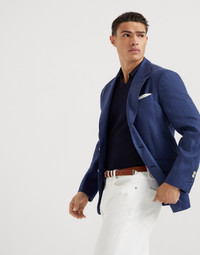 This unconstructed Cavallo blazer pairs the fresh lightness of linen with the tailored feel of chevron. The garment is enriched with the fabric’s slight slubbing and iconic details such as the oversize lapel and flap pockets. The “Solomeo Shoulder”, named after the hamlet where the company is located, characterizes the Brunello Cucinelli blazer with signature proportions. The tapered and pronounced cut of the shoulder enhances the male physique without the need for padding. MATERIALS The linen herringbone offers all of the refined qualities of the ultimate natural summer fiber. Lightweight, breathable and fluid, the fabric showcases a characteristic slubbed color that enriches the herringbone pattern with a contemporary feel. DETAILS 3-roll-2 closure with horn buttons Notched lapel Welt pockets with flap, ticket pocket with flap and chest pocket Cuffs have four horn buttons and functional buttonholes Double back vent Two interior pockets with button closure and pen holder Cupro half lining Drop 7 100% LINEN