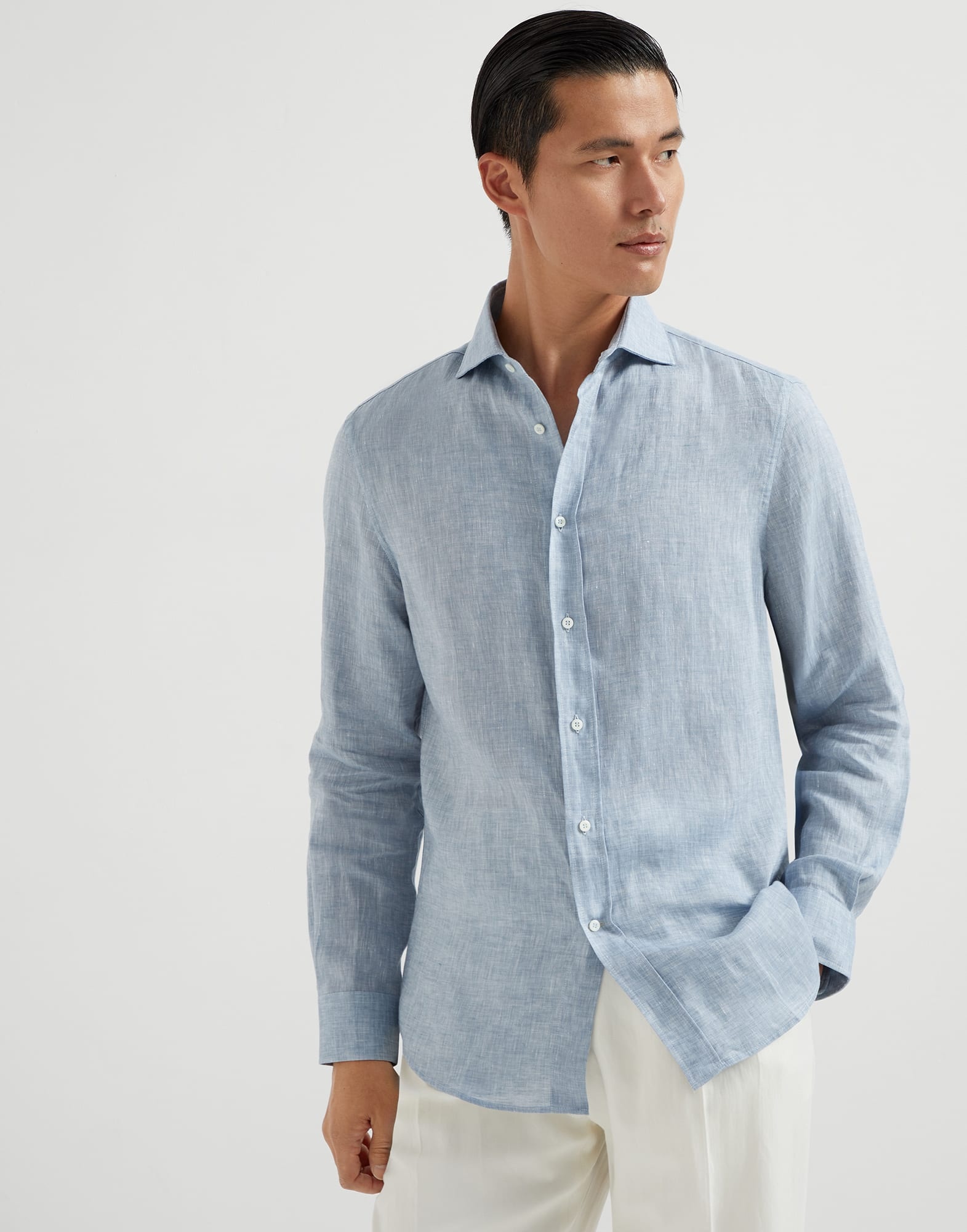 The excellence of Brunello Cucinelli materials enriches this shirt with the natural, slightly irregular effect of linen. The fabric’s ultra-lightweight, cooling touch pairs perfectly with the classic style of the spread collar. Defined by its regular, rather straight lines, the easy fit has a slightly shorter length than other fits, making it perfect to wear over trousers for a casual look. MATERIALS Thanks to its natural qualities, pure linen fabric is one of the most suitable materials for the season. Lightweight, breathable, and with a dry hand, the slightly irregular texture of the fabric is characterized by the classic slub effect created by the natural linen fibers. DETAILS Plain front closure with mother of pearl buttons Spread collar Cuffs have one mother of pearl button Easy fit 100% LINEN