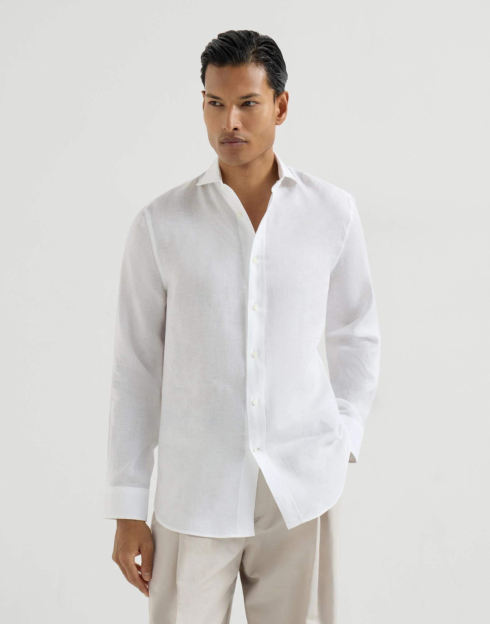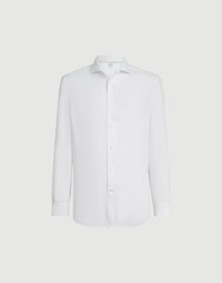 The excellence of Brunello Cucinelli materials enriches this shirt with the natural, slightly irregular effect of linen. The fabric’s ultra-lightweight, cooling touch pairs perfectly with the classic style of the spread collar. Defined by its regular, rather straight lines, the easy fit has a slightly shorter length than other fits, making it perfect to wear over trousers for a casual look. MATERIALS Thanks to its natural qualities, pure linen fabric is one of the most suitable materials for the season. Lightweight, breathable, and with a dry hand, the slightly irregular texture of the fabric is characterized by the classic slub effect created by the natural linen fibers. DETAILS Placket closure with mother of pearl buttons Spread collar Cuffs have one mother of pearl button Easy fit 100% LINEN