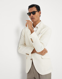 The classic feel of chevron is paired with the tailored style of this unconstructed Cavallo blazer. The fit follows the proportions that distinguish Brunello Cucinelli style: close-fitting through the chest with slightly pronounced shoulders to highlight the male physique. The angled flap pockets and wide peak lapel complete the look of the blazer. MATERIALS The combination of the linen, silk, virgin wool and cotton fibers defines the lightweight fabric with a refined look. DETAILS 3-roll-2 fastening Welt pockets with flap, ticket pocket and chest pocket Cuffs have four horn buttons and functional buttonholes Cupro half lining Double back vent 43% LINEN, 21% SILK, 21% VIRGIN WOOL, 15% COTTON