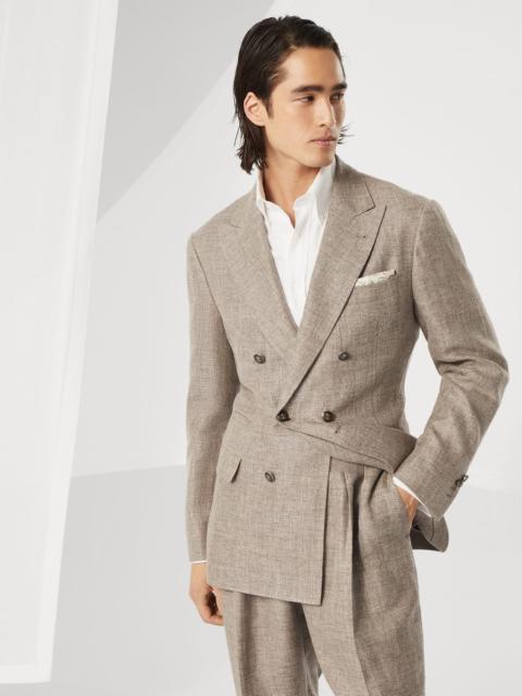 The excellence of linen, wool and silk diagonal twill is paired with the versatile, tailored style of this unconstructed blazer with patch pockets. The “Solomeo Shoulder”, named after the hamlet where the company is located, characterizes the Brunello Cucinelli blazer with distinct proportions. The tapered and pronounced cut of the shoulder enhances the male physique without the need for padding. MATERIALS Linen, wool and silk diagonal combines precious natural fibers to create a lightweight fabric with a distinctive texture. The linen element adds a slub-effect to the diagonal twill weave, enriching the season's colors. A cupro half-lining provides added comfort. DETAILS 3-roll-2 fastening Patch pockets, ticket pocket and patch chest pocket Buttons at cuffs Cupro half lining Two interior pockets with button closure and pen holder Drop 7 Double back vent 74% LINEN, 24% WOOL, 2% SILK