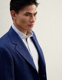 Classical canons and contemporary influences epitomize the new selection, where every element contributes to building captivating and dynamic garments that are capable of corresponding to any occasion. The deconstructed blazer, distinctive to the Brunello Cucinelli brand, is neat around the chest with slightly broader yet unpadded shoulders. MATERIALS Linen, wool and silk fabrics are high performance fabrics that are ideal for wear during the transitional months. Their characteristics, such as crease resistance and comfort, as well as lightness and versatility, make them an important element of the spring-summer wardrobe. The slight slub of the linen enhances the colors. DETAILS 3-roll-2 fastening Welt pockets with flap, ticket pocket with flap and chest pocket Cuffs with four buttons and functional buttonholes Cupro half lining Two interior pockets with button closure and pen holder Drop 7 Double back vent 74% LINEN, 24% WOOL, 2% SILK