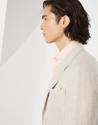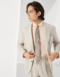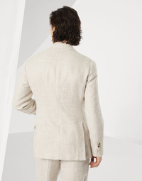 The elegant feel of linen, wool and silk diagonal twill enhances the timeless style of this unconstructed Cavallo blazer. The “Solomeo Shoulder”, named after the hamlet where the company is located, characterizes the Brunello Cucinelli blazer with distinct proportions. The tapered and pronounced cut of the shoulder enhances the male physique without the need for padding. MATERIALS Linen, wool and silk diagonal combines precious natural fibers to create a lightweight fabric with a distinctive texture. The linen element adds a slub-effect to the diagonal twill weave, enriching the season's colors. A cupro half-lining provides added comfort. DETAILS 3-roll-2 closure with horn buttons Welt pockets with flap, ticket pocket with flap and chest pocket Two interior pockets with button closure and pen holder Cuffs with four buttons and functional buttonholes Cupro half lining Double back vent 74% LINEN, 24% WOOL, 2% SILK