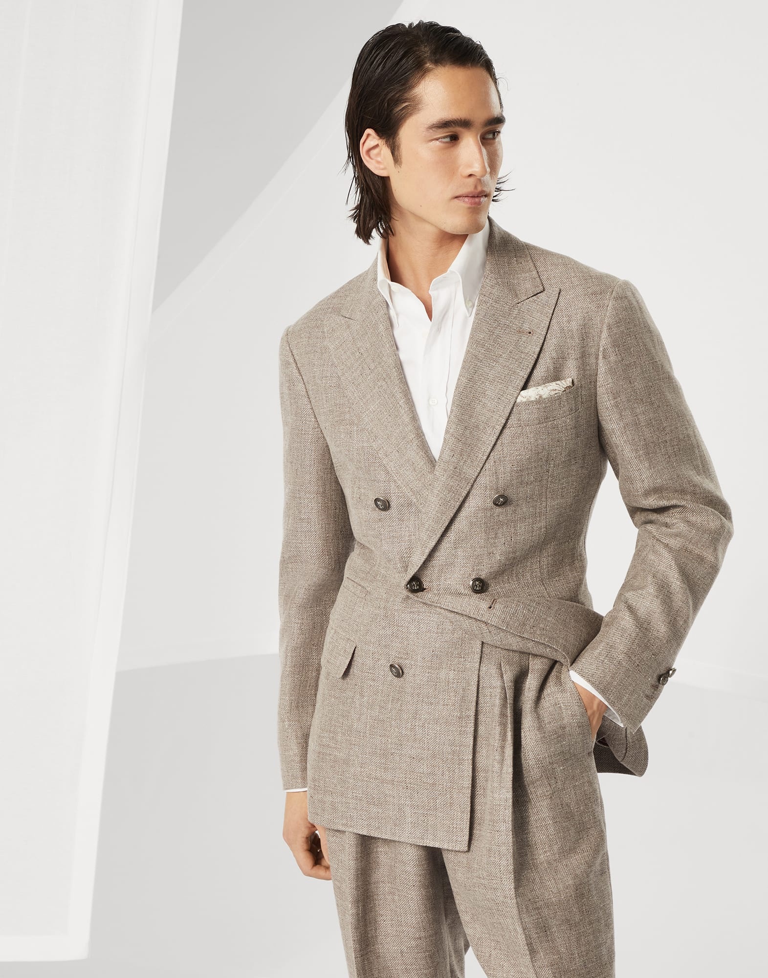 Refined Brunello Cucinelli yarns add charm and elegance to the contemporary silhouette of this unconstructed one-and-a-half-breasted jacket with peak lapel. The fabric’s diagonal weave enhances the natural properties of the linen, wool and silk fibers, providing a smooth, fluid hand and a characteristic slubbed texture that accentuates the season’s colors. The “Solomeo Shoulder”, named after the hamlet where the company is located, characterizes the Brunello Cucinelli jacket with signature proportions. The tapered and pronounced cut of the shoulder enhances the male physique without the need for padding. MATERIALS The linen, wool and silk diagonal twill blends refined natural fibers to create a lightweight, durable and glossy fabric. The linen component gives the diagonal weave a slubbed effect, enriching the season’s colors. The jacket is completed with a cupro lining that perfects the comfort. DETAILS Six button fastening Peak lapel Welt pockets with flap, ticket pocket and chest pocket Cuffs have four horn buttons and functional buttonholes Two interior pockets with button closure and pen holder Lined Double back vent Drop 7 74% LINEN, 24% WOOL, 2% SILK
