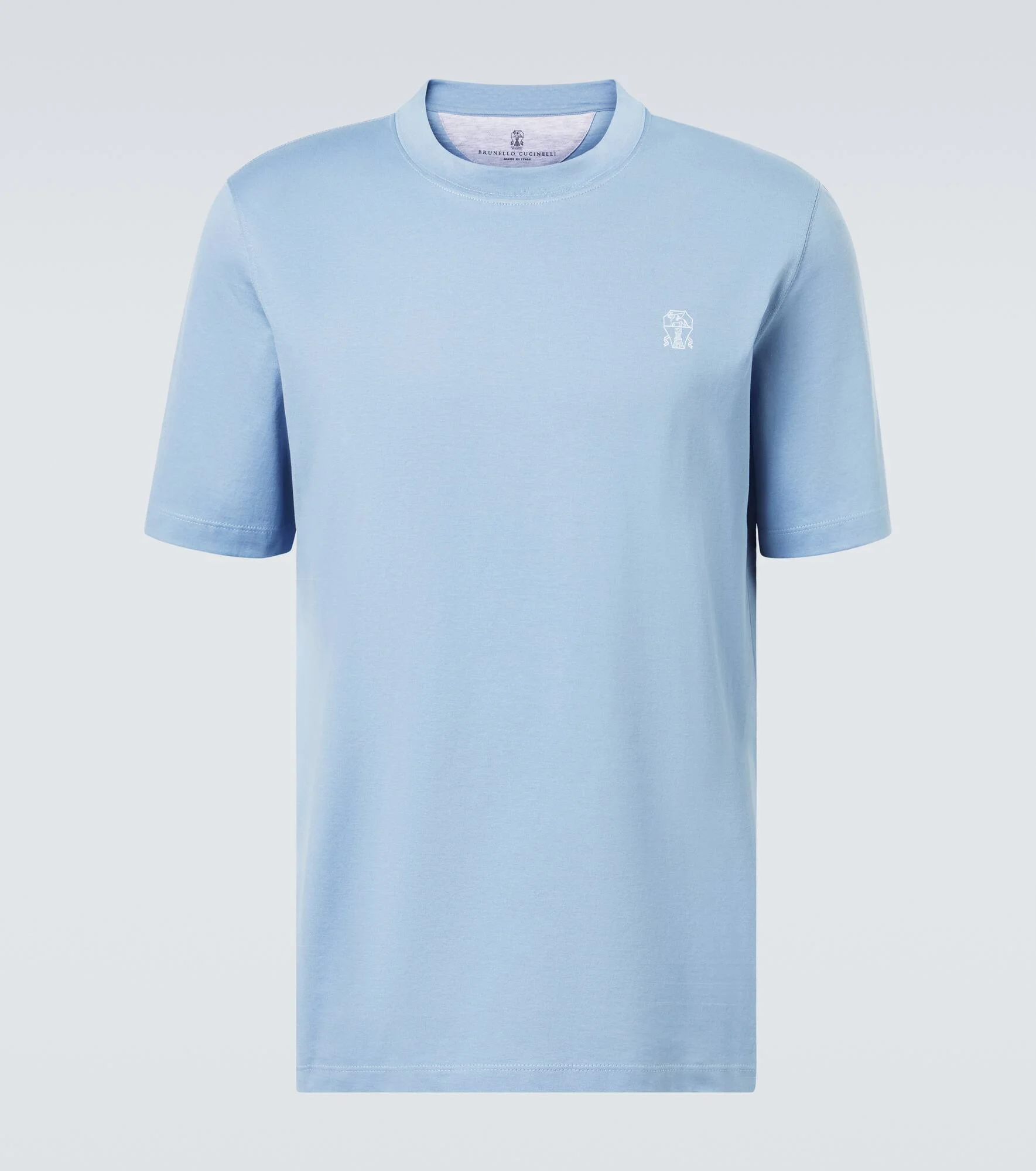 Brunello Cucinelli's designs are created in Solomeo, where art and traditions are woven into the house's every fiber. This cotton jersey T-shirt features a classic design with the brand's logo on the front for a refined touch. Product Details - Material: 100% cotton - Care instructions: machine wash at 30 degrees - Made in Italy - Designer color name: Cjd84 - Item color: blue - Item number: P01056040 Size & Fit - True to size - Straight fit - Slightly stretchy fabric - Falls to the hip - The model in the picture is 185cm-6'1" and wearing a size M