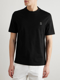 EXCLUSIVE AT MR PORTER. It's the commitment to quality fabrics and details that sets Brunello Cucinelli's staples apart – everything is made in specialist factories across Italy. This T-shirt is cut from soft cotton-jersey and printed with a crest that commemorates the label's hometown of Solomeo, Italy. Size & Fit - Fits true to size. Take your normal size - Designed for a regular fit - Mid-weight, slightly stretchy fabric - Model is shown wearing a M - Model measures: chest 38"/ 96cm Details & Care - Black and white cotton-jersey - 100% cotton - Machine wash