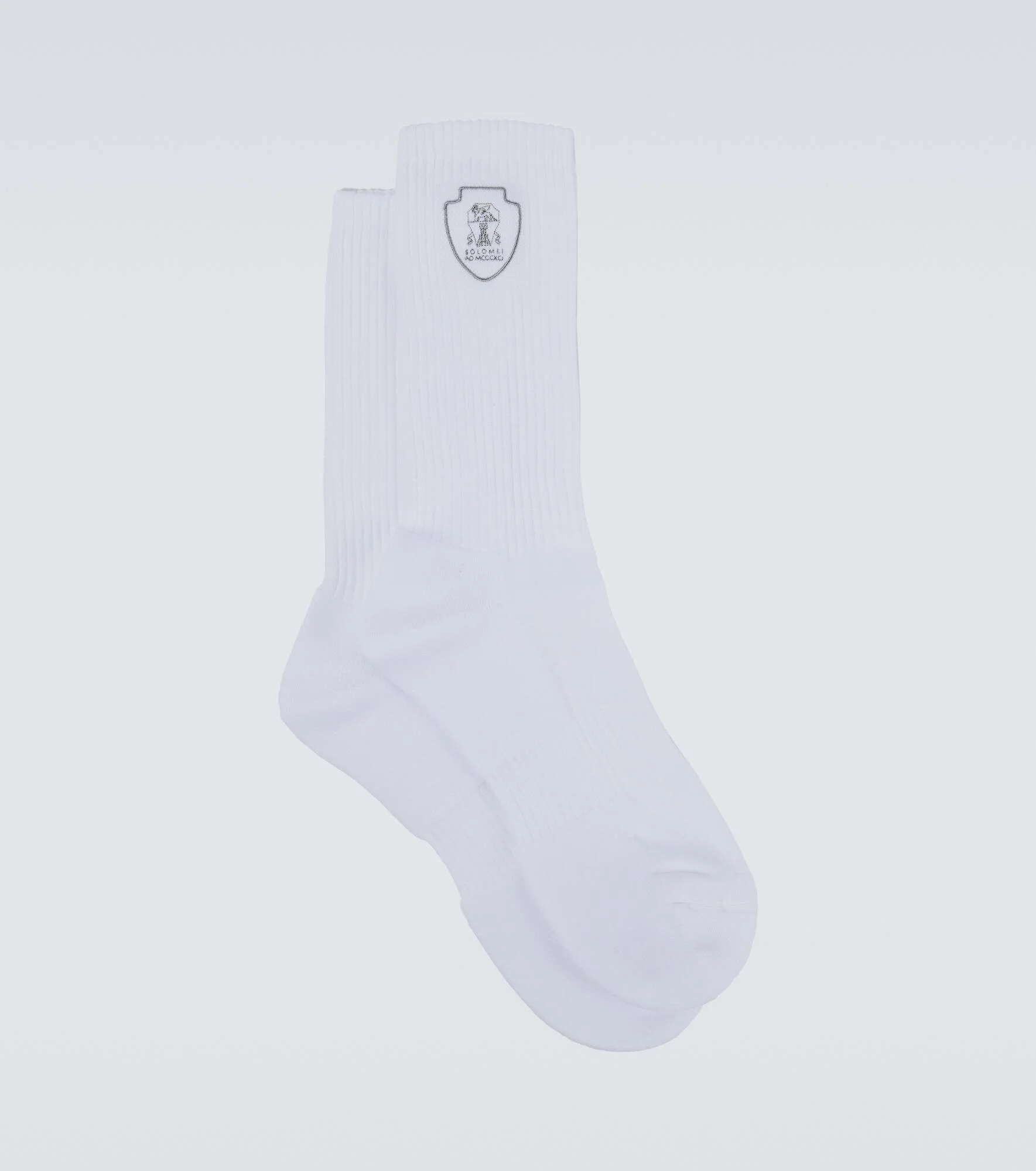 Carry style with you at every step in these Brunello Cucinelli socks. Made from a soft cotton blend, the pair features a ribbed-knit finish and an embroidered logo on the sides. Product Details - Material: 77% cotton, 20% polyamide, 3% elastane - Care instructions: dry clean - Made in Italy - Designer color name: Bianco + Grigio Chiaro - Item color: white - Item number: P01138532 Size & Fit - Size S = EU shoe size 41, 25cm-10" - Size M = EU shoe size 42, 26cm-10" - Size L = EU shoe size 43, 27cm-10.5" - Size XL = EU shoe size 44, 28cm-11" - Size XXL = EU shoe size 45
