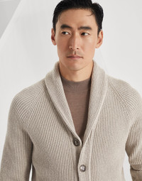Refined materials with a distinct appearance enrich the versatile feel of this cardigan. The slightly irregular effect of cotton malfile yarn enhances the iconic English rib knit texture with an elegant, lightweight touch. The shawl lapel and horn buttons closure is complemented by the raglan sleeve construction, a clever combination of classic and sporty elements. MATERIALS Pure cotton malfile threads with an irregular diameter create a light, textured and slightly rustic fabric. DETAILS Metal button closure Shawl collar Raglan sleeve Horizontal hand pockets Rib knit cuffs and bottom band English rib 100% COTTON
