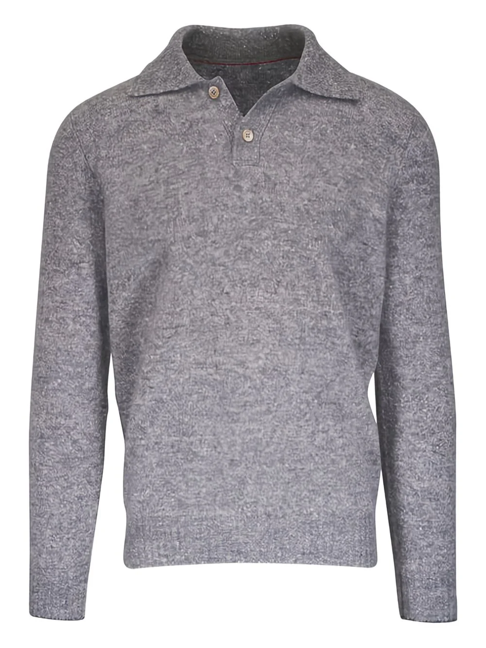 long-sleeve polo shirt Highlights - Grey - Polo neck - Short button fastening - Long sleeves - Ribbed cuffs Made in Italy Composition Alpaca 36%, Polyamide 25%, Wool 13%, Silk 13%, Fabric 13% Washing instructions Read Manufacturer Guidelines
