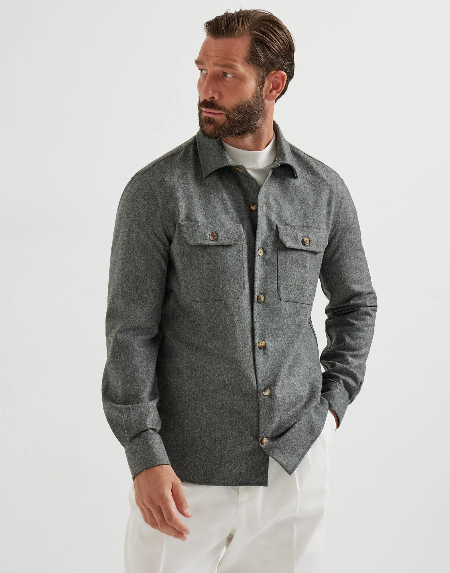 Inspired in shape and proportions by shirt-like outerwear, this new overshirt pairs an informal attitude and refined materials for a mix of elegant style. The lightness of the virgin wool flannel enhances the garment’s unconstructed design. The chest pockets add a touch of utility wear inspiration. MATERIALS The soft, lightweight pure wool flannel enhances the noble qualities of the natural fiber, while the twill weave showcases the fabric’s diagonal texture. DETAILS Horn button closure Shirt-style collar Unlined Upper pockets with flap and button Button cuffs Single back vent with buttons 100% VIRGIN WOOL
