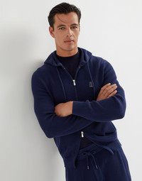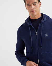 Iconic Brunello Cucinelli workmanship updates the look of this classic, sporty sweatshirt-like style from the Travelwear line, dedicated to moments of relaxation and leisure. Cotton English rib knitting elevates the essential design of the sweater, featuring a zipper closure and hood. The Solomeo logo completes the garment with an elegant note. MATERIALS Manufacturing of the pure cotton yarn enhances the qualities of the natural fibers and makes the garment lightweight and comfortable to wear. DETAILS Two-way zip closure Adjustable drawstring hood Hand pockets Rib knit cuffs and bottom band 100% COTTON