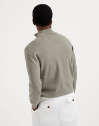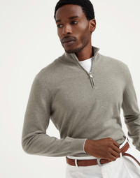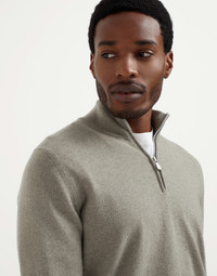 Refined pure cashmere yarn, iconic to Brunello Cucinelli collections, elevates the style of this turtleneck sweatshirt. Contrast color details on the half-zipper and cuff edges add a sophisticated touch to the garment, which offers a regular fit with proportions that remain close to the body. MATERIALS The noble cashmere fiber is characterized by an extreme fineness and also for its precious insulating qualities which guarantee warmth, providing coverage and lightness when worn. DETAILS Zip opening High collar in rib knit Rib knit cuffs and bottom band Plain stitch 100% CASHMERE