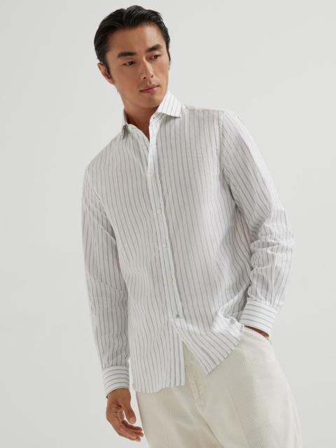 The excellence of natural fibers enhances the contemporary silhouette and impeccable construction of this easy fit shirt with spread collar. Made of pure cotton, the lightweight, versatile fabric is enriched with a textured striped pattern, creating a dynamic effect with visual depth. Defined by its regular, rather straight lines, the easy fit has a slightly shorter length than other fits, making it perfect to wear over trousers for a casual look. MATERIALS The cotton striped and textured canvas fabric offers a reinterpretation of the striped pattern with a subtly three-dimensional effect that enhances its breathability and lightness. DETAILS Placket closure with mother of pearl buttons Spread collar Cuffs have one mother of pearl button Easy fit 100% COTTON