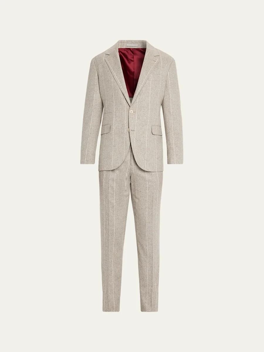 Brunello Cucinelli donegal two-piece suit highlighted with wide pinstripes Silk/wool/cashmere Lining: Acetate/cotton/cupro/viscose Dry clean Made in Italy Jacket: Notched lapels Single-breasted front Barchetta chest pocket Hip flap pockets; ticket pocket Internal breast pocket Basted sleeves Double-vented back Pants: Extended button-zip fly; belt loops Single pleated front Side slip pockets Classic fit through straight legs Unfinished hem to be tailored to desired length Online Inquiries: BGS21_NDGDQ| Store Inquiries: #5039281