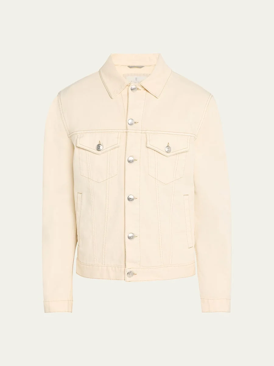 Brunello Cucinelli dyed denim trucker jacket Spread collar; button front Long sleeves; button cuffs Buttoned chest flap pockets Sideentry welt pockets Yoked back Midlength Classic fit Cotton/elastane Lining: Cotton Machine wash cold Made in Italy