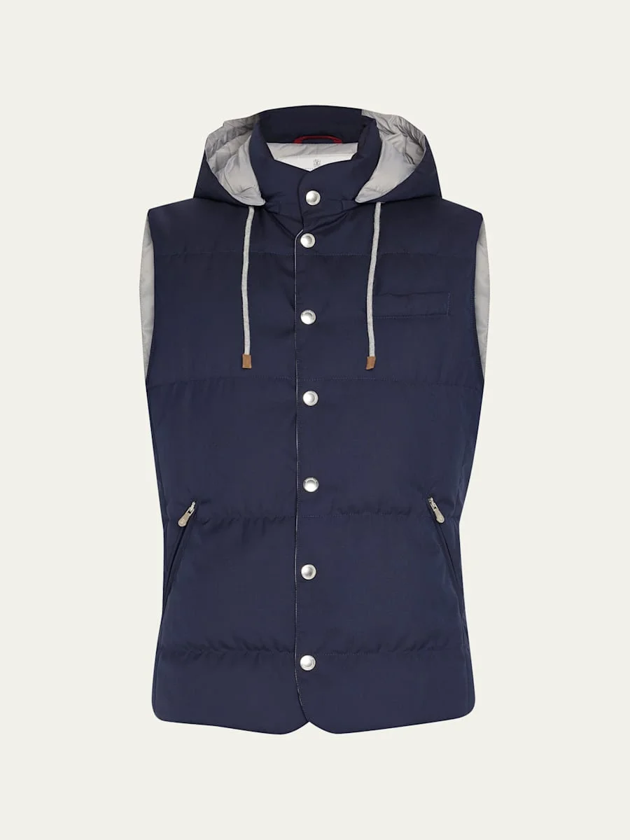 Brunello Cucinelli vest featuring down-filled quilted fabric Hooded drawstring neckline Snap placket Chest welt pocket Side zip pockets Sleeveless Classic fit Feather/down fill Cotton Made in Italy Model is 6'1"/185cm. Online Inquiries: BGS21_N97YH| Store Inquiries: #4303336