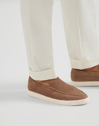 The timeless elegance of the loafer is updated thanks to modern silhouettes and iconic materials in these chevron-effect suede loafers. The leather’s distinctive velvety texture is covered in a chevron pattern, bringing to mind the elegance of menswear tailoring. A light rubber outsole defines the footwear’s comfort. MATERIALS The refined suede is characterized by a classic velvety hand that enhances its casual feel. A leather lining and a natural latex bottom provide added comfort. DETAILS Leather lining Rubber outsole REAL LEATHER