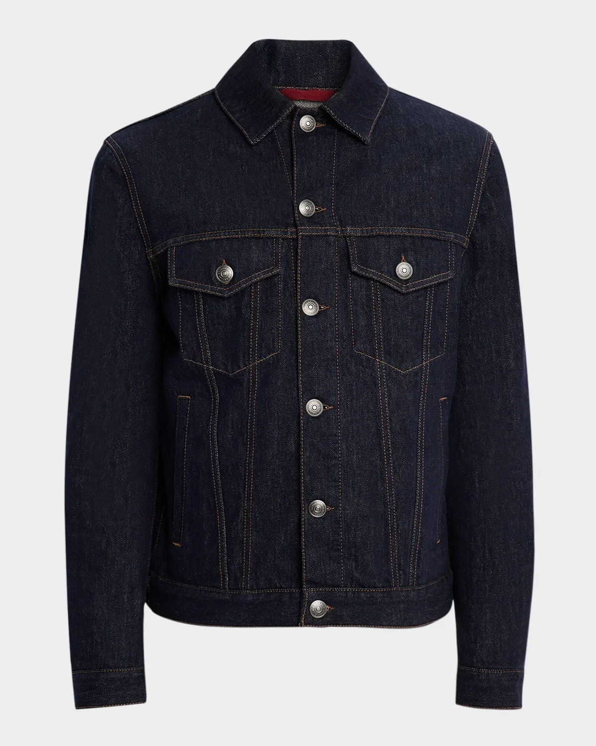 - Brunello Cucinelli jacket in Italian selvedge denim accented with branded metal buttons - Spread collar - Button front - Chest flap pockets - Side welt pockets - Long sleeves - Single-button cuffs - Hem adjusters - Cotton - Unlined - Dry clean, machine wash line dry - Made in Italy