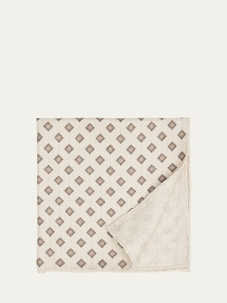 Brunello Cucinelli double-faced pocket square showcasing a geometric medallion pattern Basketweave pattern on the reverse side Contrast trim May be styled multiple ways Silk Hand wash or dry clean Made in Italy Online Inquiries: BGS21_NDPJS| Store Inquiries: #5041520