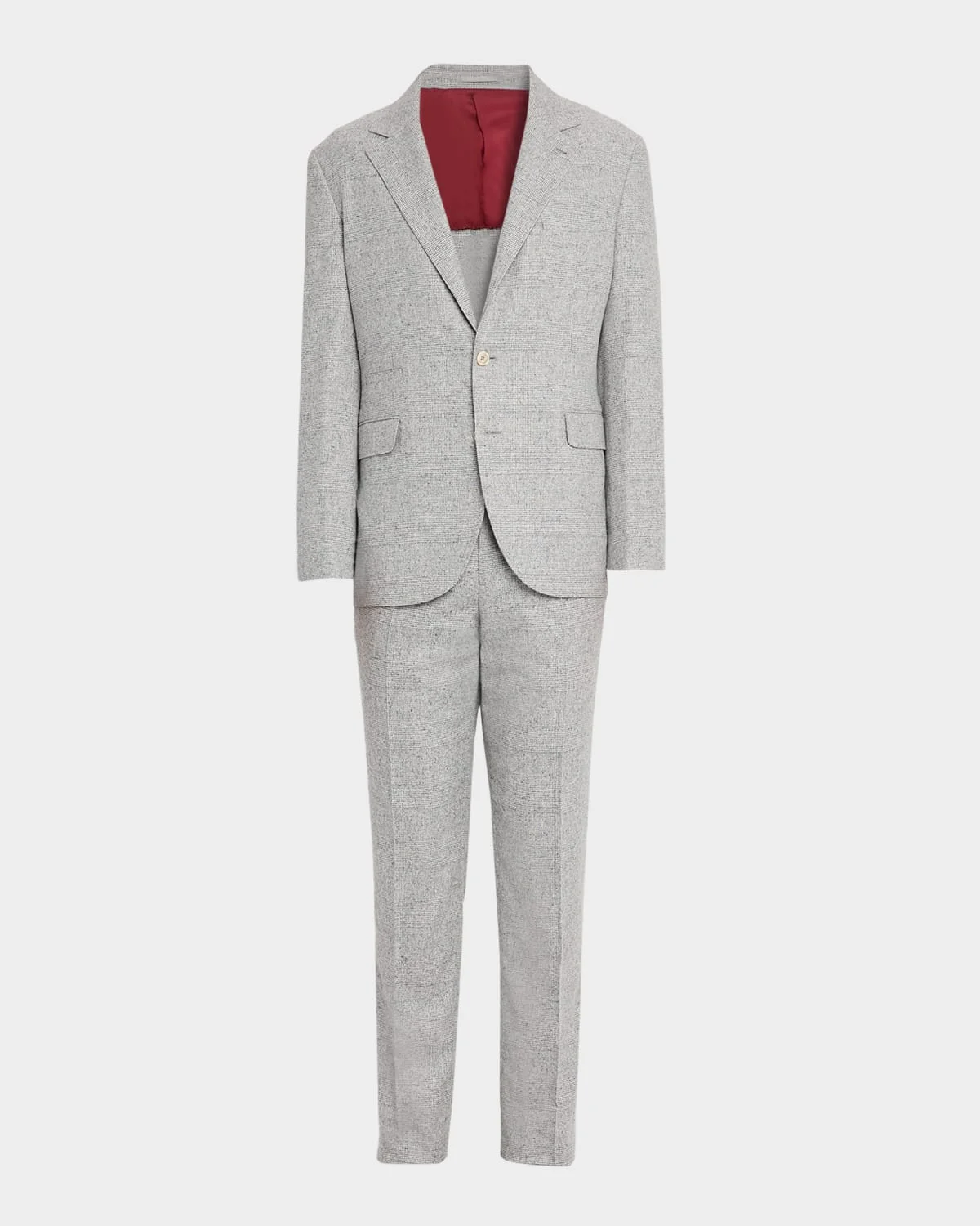- Brunello Cucinelli two-piece suit in subtle Prince of Wales plaid with a donegal effect - Wool/silk/cashmere - Lining: Acetate/cotton/cupro/viscose - Dry clean - Made in Italy - Jacket: - Notched lapels - Single-breasted front - Barchetta chest pocket - Hip flap pockets; ticket pocket - Internal breast pocket - Long sleeves - Double-vented back - Pants: - Single pleated front - Side slip pockets - Classic fit through straight legs - Unfinished hem to be tailored to desired length