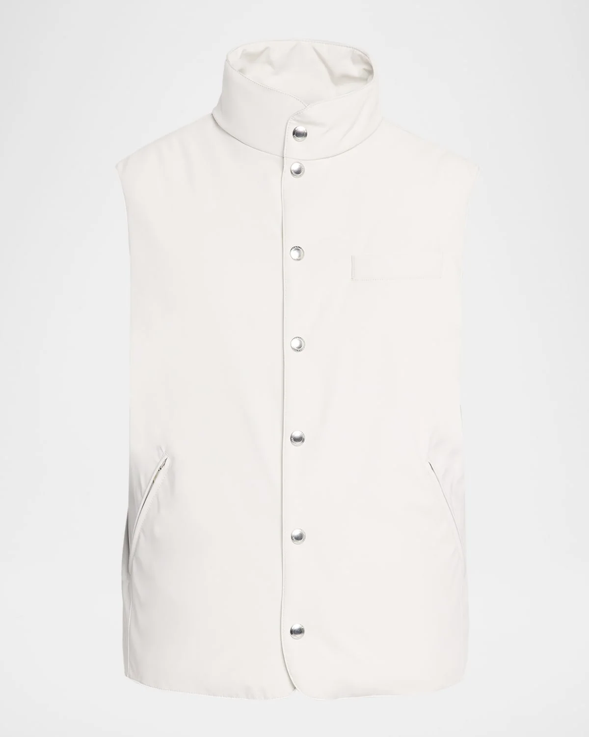 - Brunello Cucinelli vest in durable nylon with a satin finish - Down/feather padded fill - Stand collar - Snap front - Side zip pockets - Sleeveless - Curved hem - Nylon/polyamide/elastane - Lining: Cotton/nylon - Hand wash or dry clean - Made in Italy