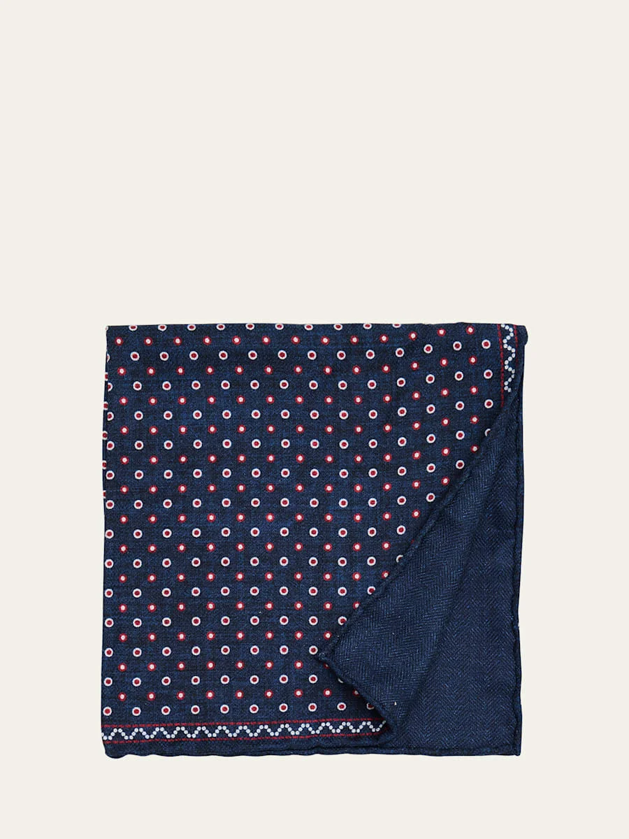 Brunello Cucinelli double-faced pocket square showcasing a polka dot print with dotted border detailing Micro-chevron pattern on the reverse side May be styled multiple ways Silk Hand wash or dry clean Made in Italy Online Inquiries: BGS21_NDKK2| Store Inquiries: #5041526