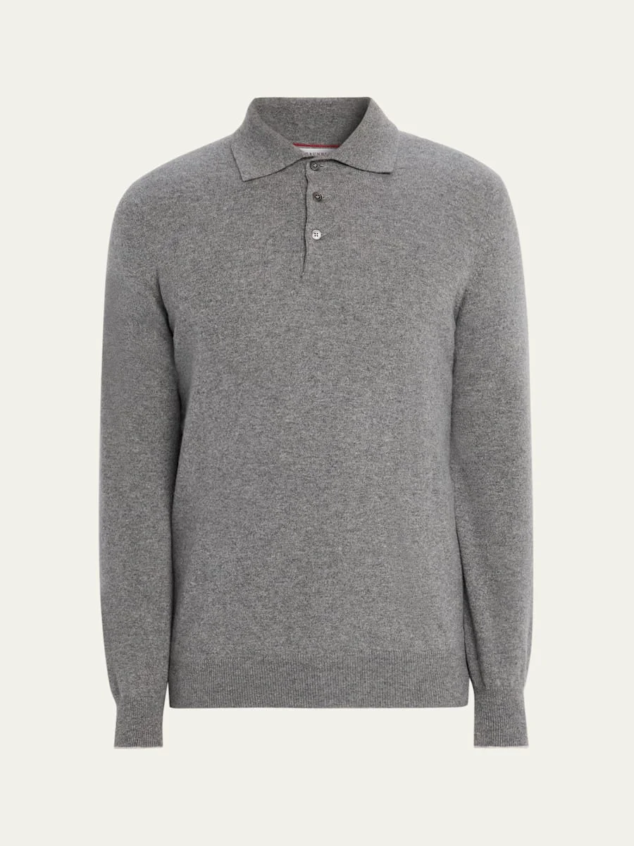 Brunello Cucinelli polo sweater in a soft cashmere revealing a dimensional melange effect Genuine motherofpearl buttons Spread collar Threebutton placket Long sleeves Ribbed cuffs with tipping Ribbed hem Classic fit Pullover style Cashmere Unlined Dry clean Made in Italy