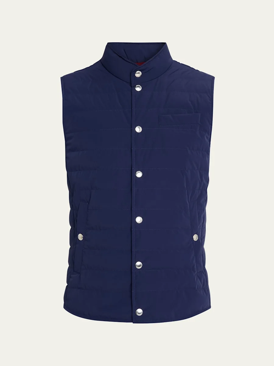 Brunello Cucinelli vest in lightly quilted nylon Stand collar Snap front Branded metal buttons Chest welt pocket Side slip pockets Sleeveless Nylon/elastane Unlined Dry clean, machine wash line dry Made in Italy