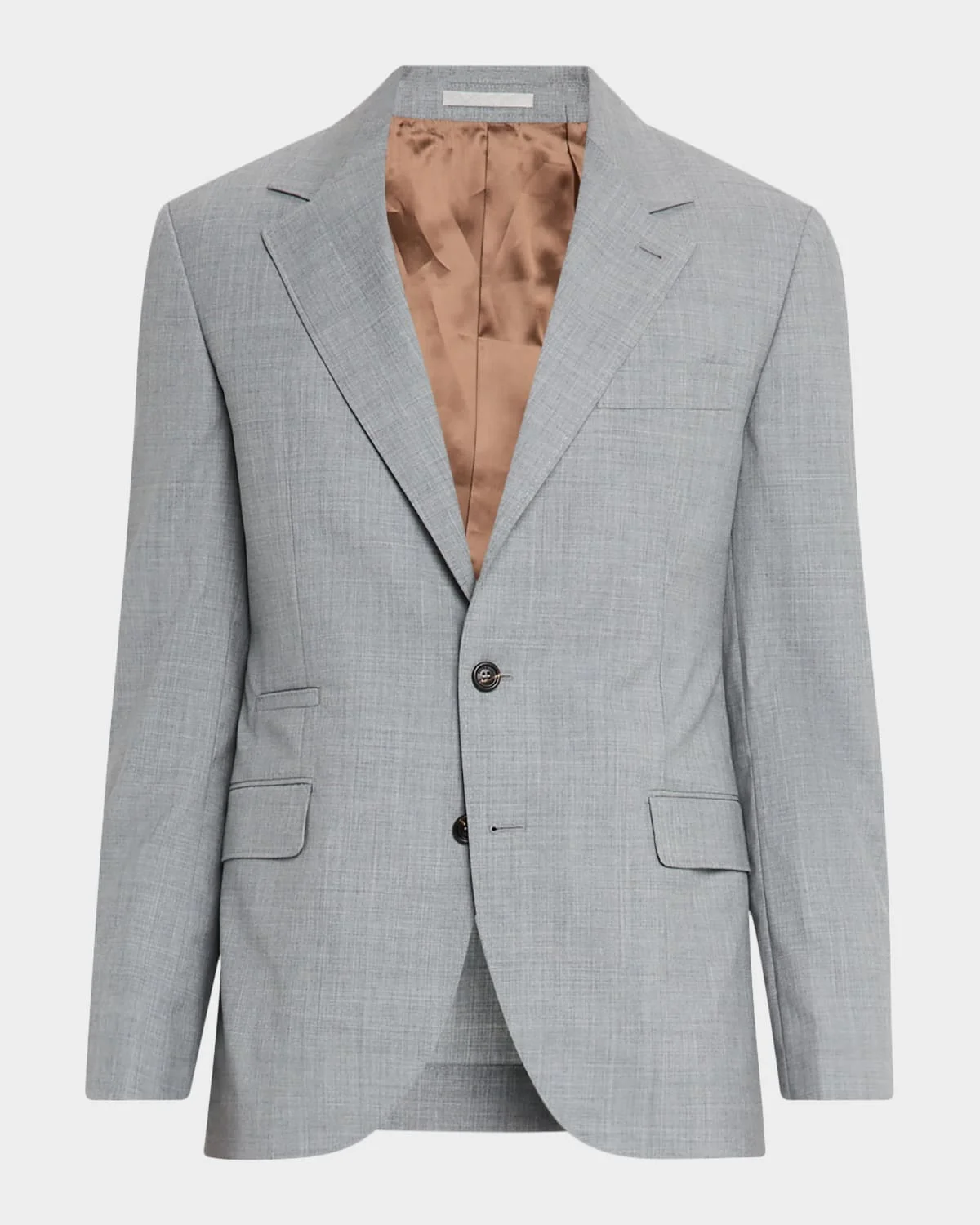 The refined qualities of virgin wool are accentuated with a tapered chest and slightly pronounced shoulders on this Brunello Cucinelli blazer, which highlights the male physique. Notch lapels Chest welt pocket Hip flap pockets; ticket pocket Doublevented back Virgin wool Lining: Acetate/cotton/cupro/viscose Dry clean Made in Italy