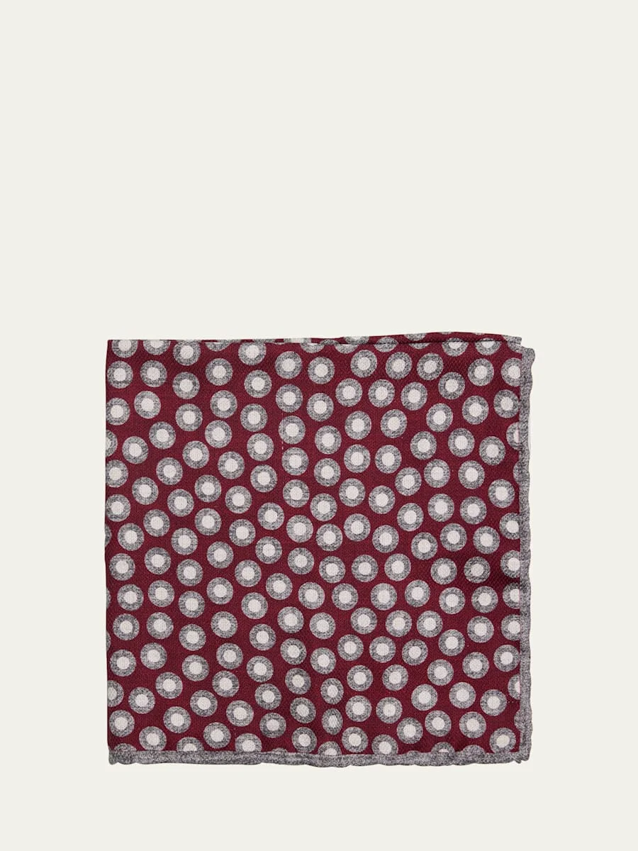 Brunello Cucinelli pocket square in lightweight and luxurious silk highlighted with a geometric circle print Approx. 17"L x 17"W Contrast trim Silk Made in Italy Online Inquiries: BGS21_NDKK0| Store Inquiries: #5041522