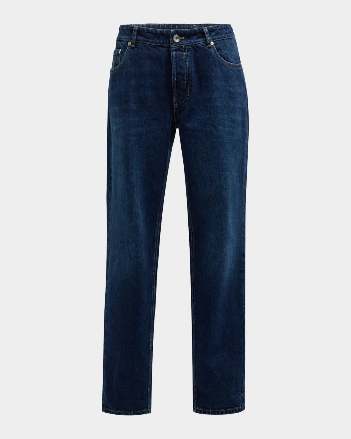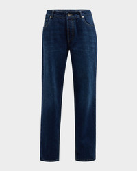 - Brunello Cucinelli jeans in light-wash denim with subtle fading - Regular rise - Flat front - Five-pocket style - Slim legs - Full length - Classic fit through the hips and thighs - Button-zip front; belt loops - Cotton - Made in Italy - Model is 6'1"/185cm.