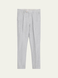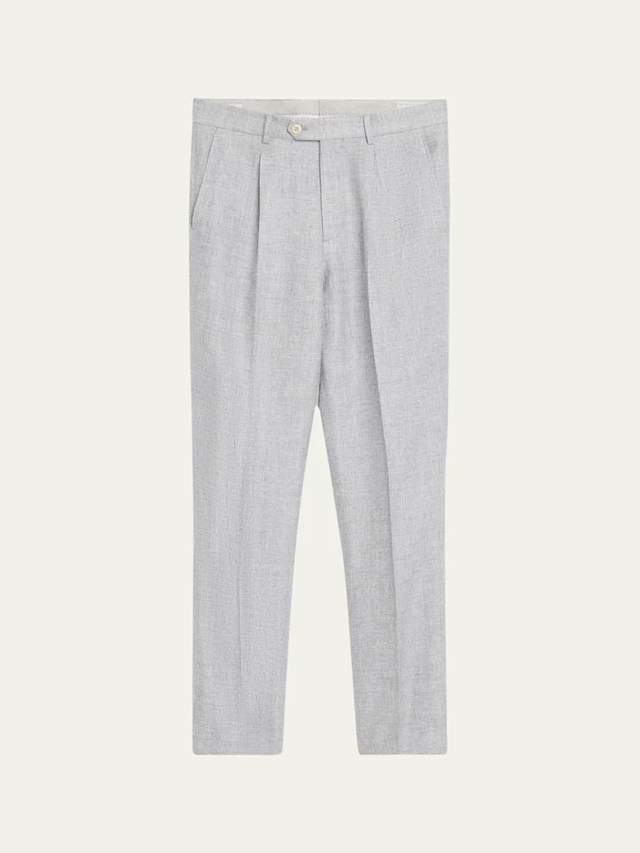 Brunello Cucinelli pants in a linen blend Single-pleated front Side slip pockets Back welt pockets Classic fit through straight legs Extended button-zip front; belt loops Linen/wool/silk Lining: Acetate/cotton/cupro/viscose Dry clean Made in Italy Online Inquiries: BGS21_NCQ42| Store Inquiries: #4894894