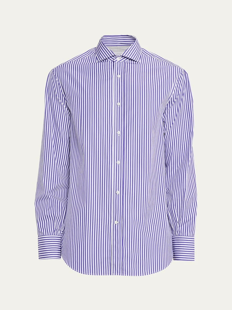 Brunello Cucinelli shirt in striped poplin accented with contrast striped cuffs Spread collar; button front Long sleeves Shirttail hem Basic fit Cotton Made in Italy Online Inquiries: BGS21_NDL5D| Store Inquiries: #5042705