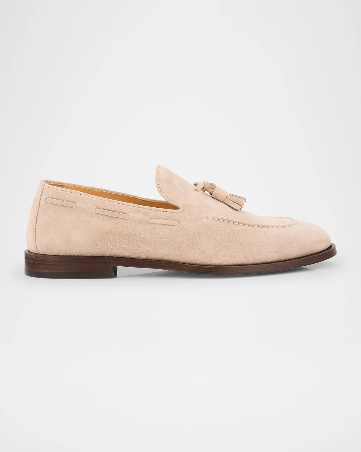 - Brunello Cucinelli exclusive tassel loafers in suede - Stacked heel - Round apron toe - Suede tassels - 360-degree lacing - Leather flex sole - Slip-on style - Made in Italy