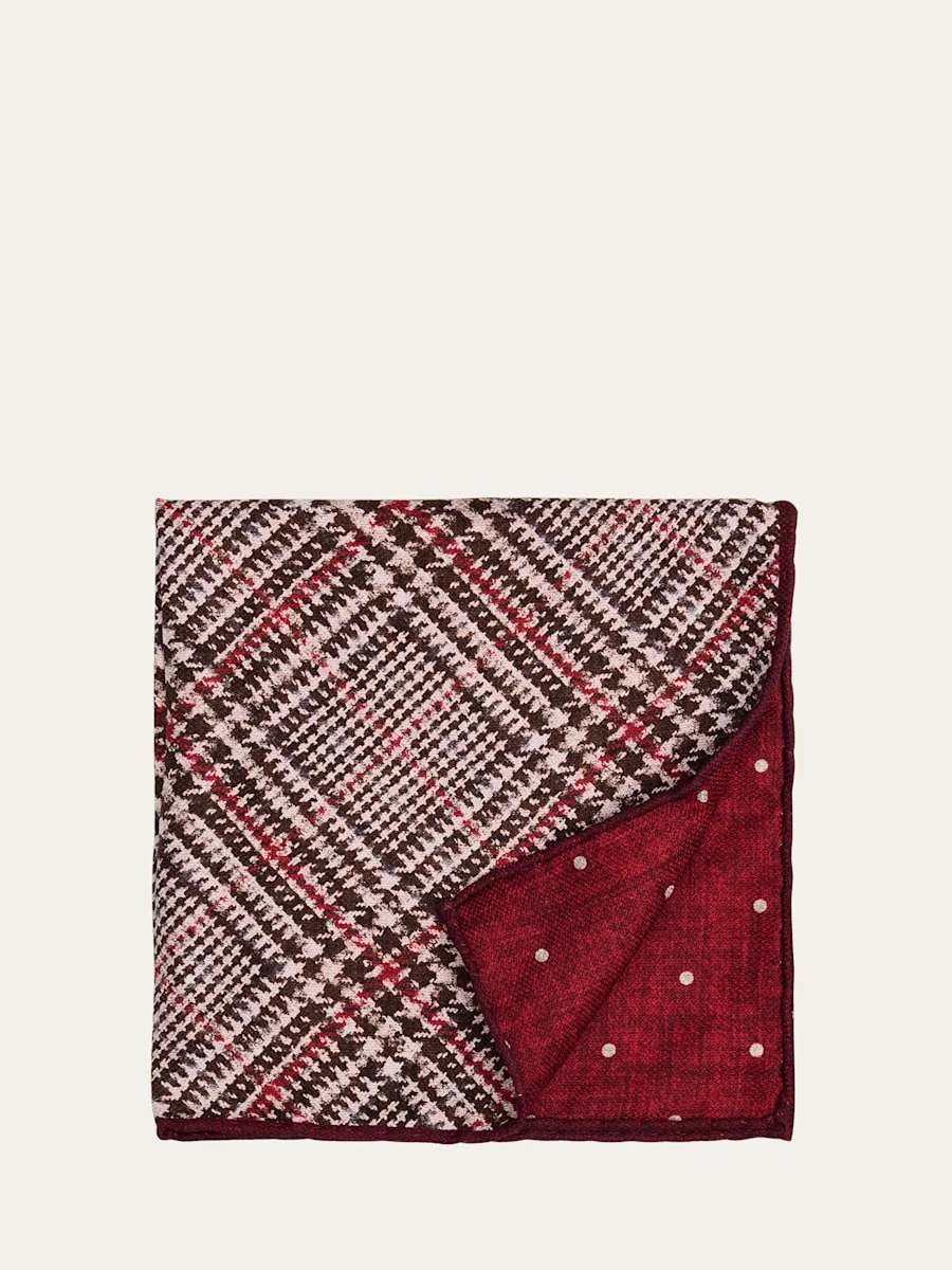Brunello Cucinelli double-faced pocket square showcasing a multi-tartan plaid pattern Polka dot pattern on the reverse side Contrast trim May be styled multiple ways Silk Hand wash or dry clean Made in Italy Online Inquiries: BGS21_NDKKA| Store Inquiries: #5041534