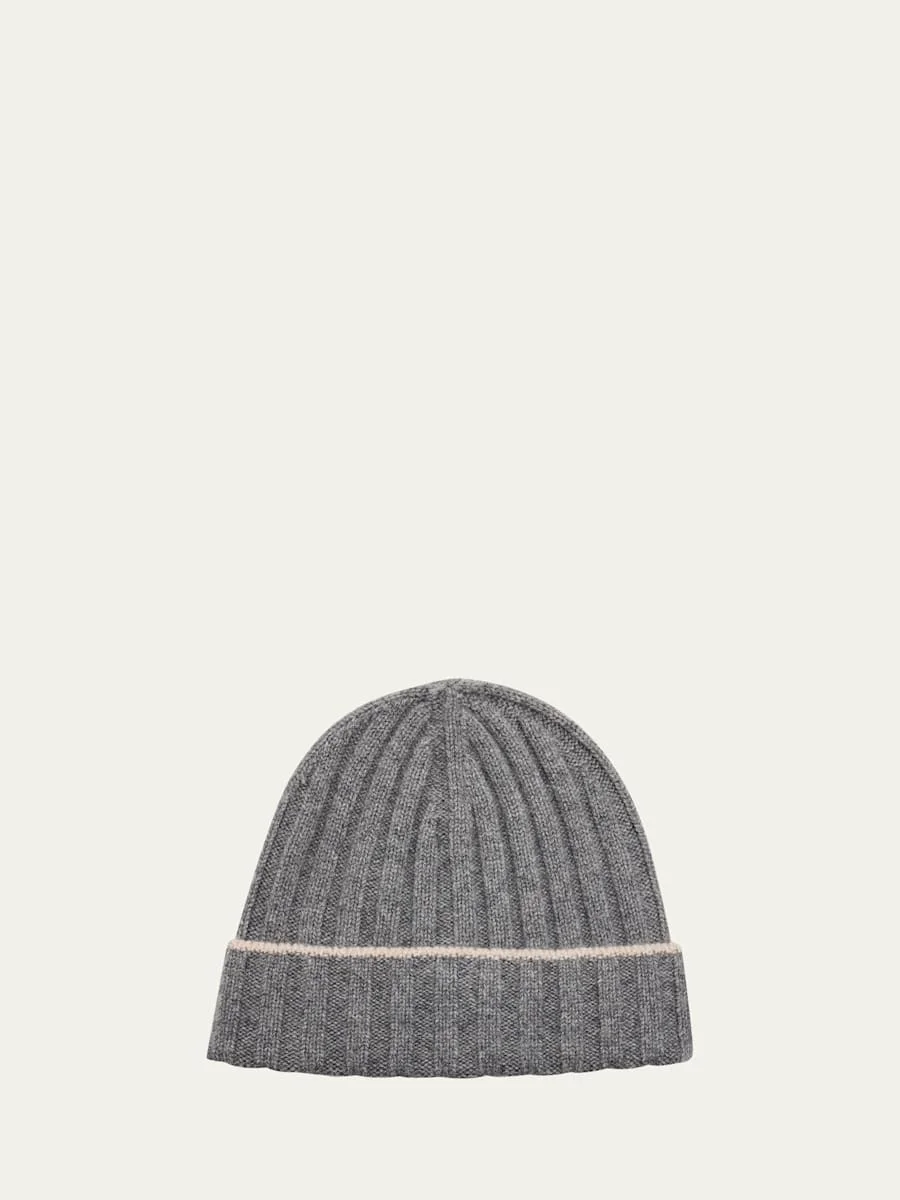 Brunello Cucinelli beanie hat in soft ribbed cashmere highlighted with contrast tipping Foldover brim Cashmere Hand wash or dry clean Made in Italy Online Inquiries: BGS21_NDKK9| Store Inquiries: #5041533