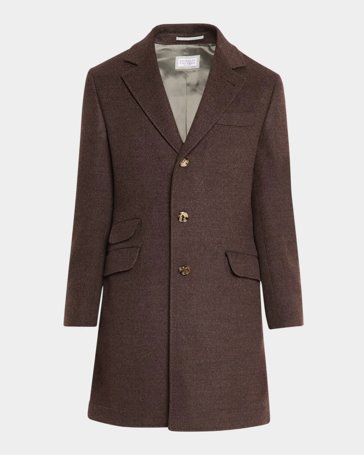 - Brunello Cucinelli overcoat in premium wool for added warmth and softness - Notched lapels - Single breasted front - Three hip flap pockets - Long sleeves - Four-button cuffs - Double-vented back - Mid-length - Classic fit - Wool - Lining: Cotton/cupro - Dry clean - Made in Italy