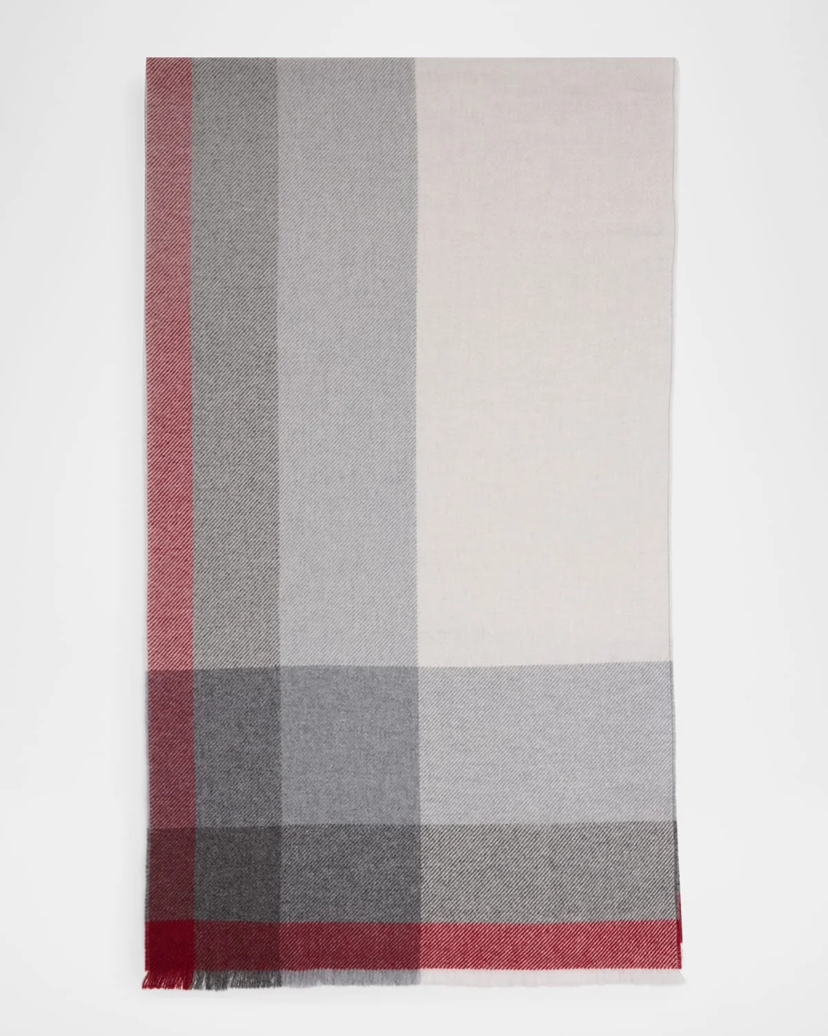 Brunello Cucinelli uneven plaid scarf in a luxurious woolcashmere blend Features eyelash fringe trim Wool/cashmere Hand wash or dry clean Made in Italy