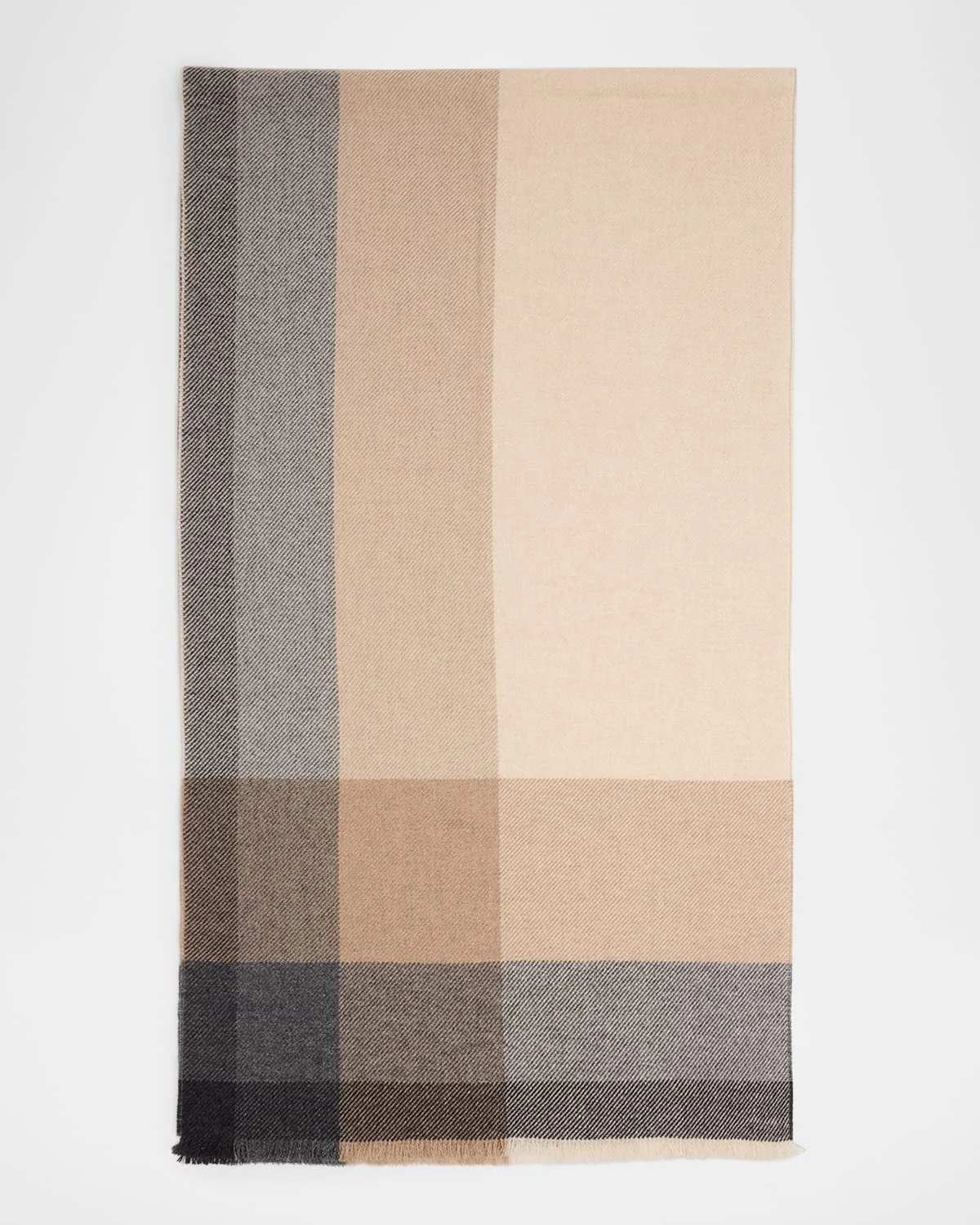 Brunello Cucinelli uneven plaid scarf in a luxurious woolcashmere blend Features eyelash fringe trim Wool/cashmere Hand wash or dry clean Made in Italy