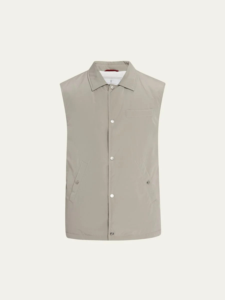 Brunello Cucinelli water resistant vest with branded metal buttons Spread collar Snap front Chest welt pocket Waist welt pockets; snap closure Sleeveless Polyester/nylon Lining: Nylon Dry clean Made in Italy Online Inquiries: BGS21_NCQ3R| Store Inquiries: #4894864