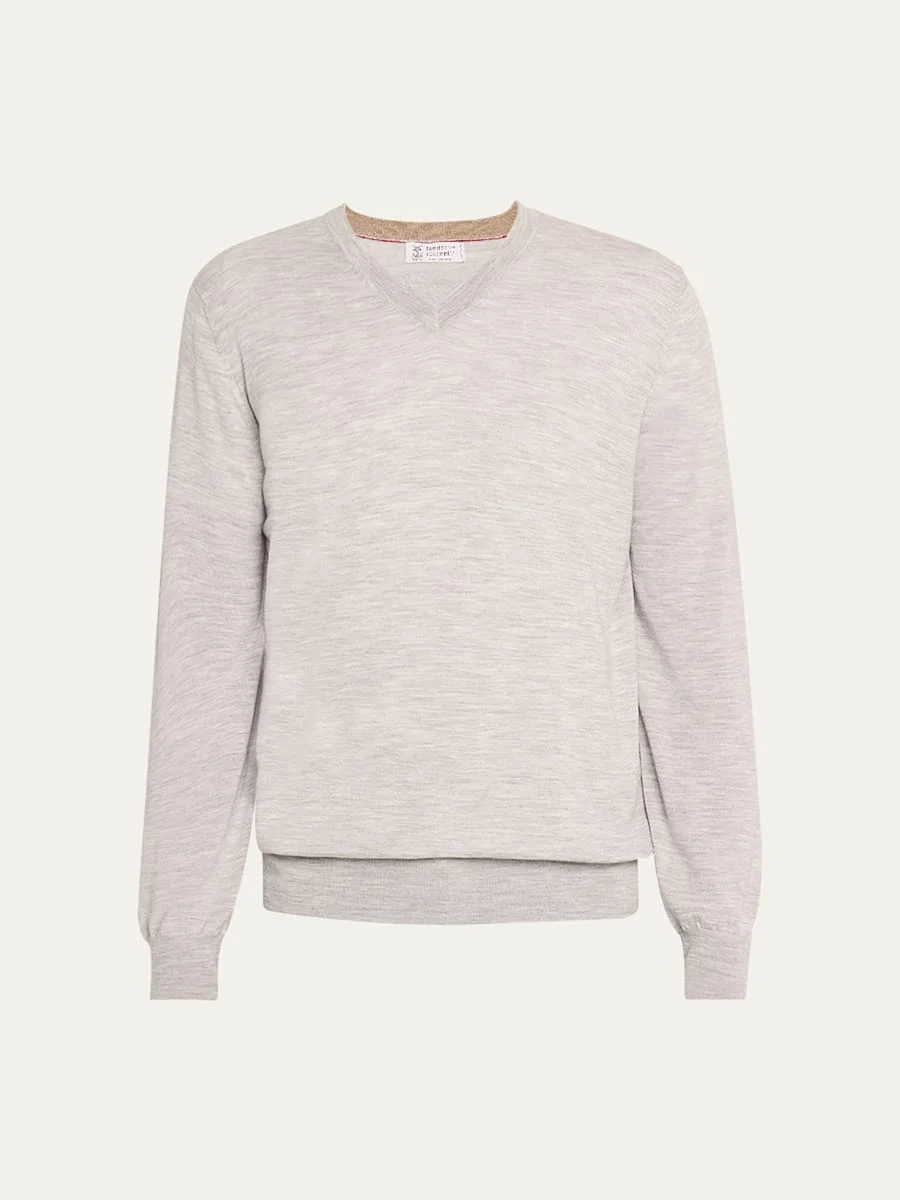 Brunello Cucinelli sweater in fine-gauge wool and cashmere V-Neckline Long sleeves Ribbed cuffs and hem Pullover style Virgin wool/cashmere Unlined Dry clean Made in Italy Online Inquiries: BGS21_NCQ5G| Store Inquiries: #4927116