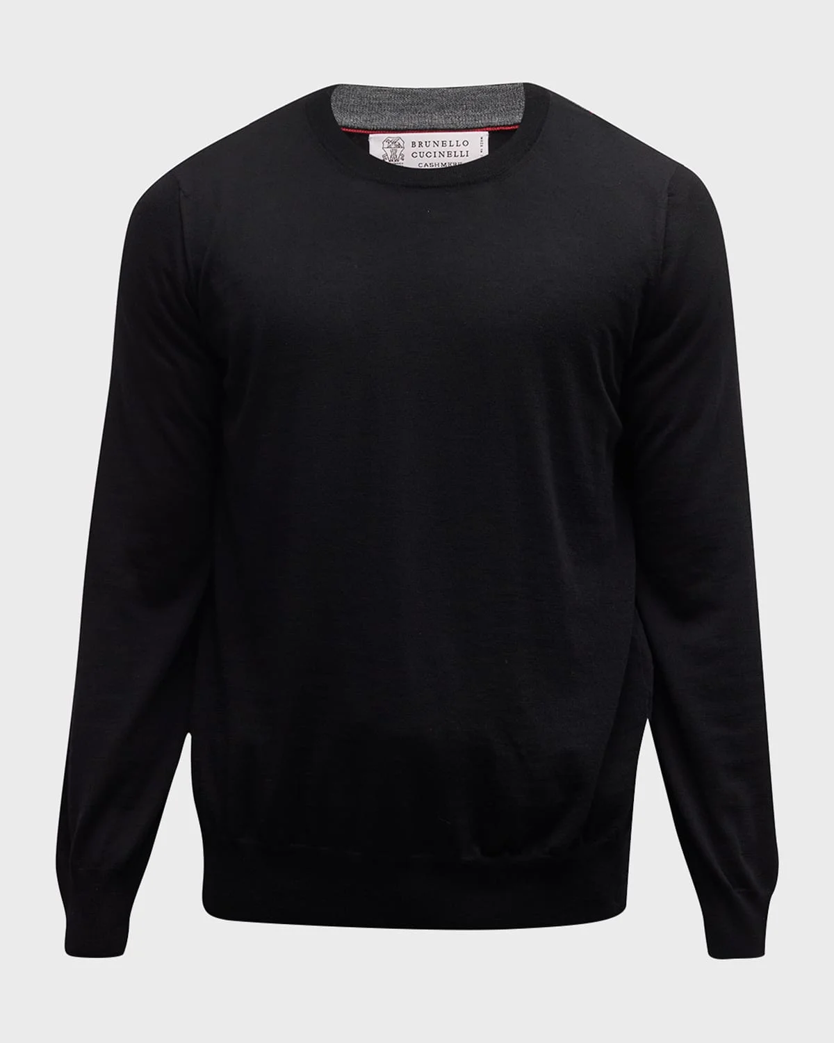 - Brunello Cucinelli solid knit sweater in fine-gauge wool and cashmere - Crew neckline - Long sleeves - Ribbed cuffs and hem - Pullover style - Virgin wool/cashmere - Unlined - Hand wash or dry clean - Made in Italy - Model is 6'1"/185cm.
