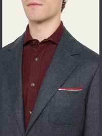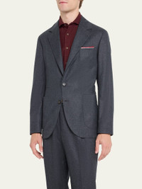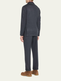 Brunello Cucinelli suit in solid flannel Virgin wool Lining: Acetate/cotton/cupro/viscose Made in Italy Jacket: Notched lapels Twobutton front Chest and side patch pockets Ticket pocket at right hip Unfinished sleeves Doublevented back Trousers: Regular rise Pleated front Button tab/zip closure; belt loops Side slip pockets Back welt pockets Unfinished hem to be tailored to desired length