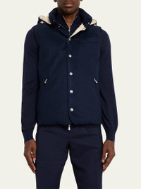 This vest by Brunello Cucinelli is crafted from wool flannel with a detachable hood and waterrepellent nylon lining Hooded neckline with adjustable drawcords Sleeveless Chest welt pocket Side zipped pockets Internal buttoned pockets Snap button front closure Wool Goose down padding Made in Italy