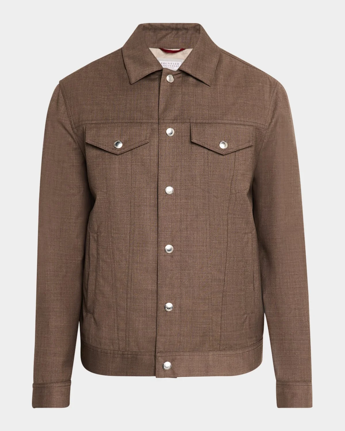 - Brunello Cucinelli trucker jacket in wool - Spread collar - Snap placket - Chest flap pockets - Hip welt pockets - Long sleeves - Single-snap cuffs - Side adjusters - Virgin wool - Lining: Nylon - Dry clean - Made in Italy