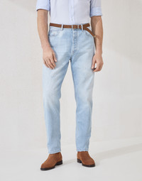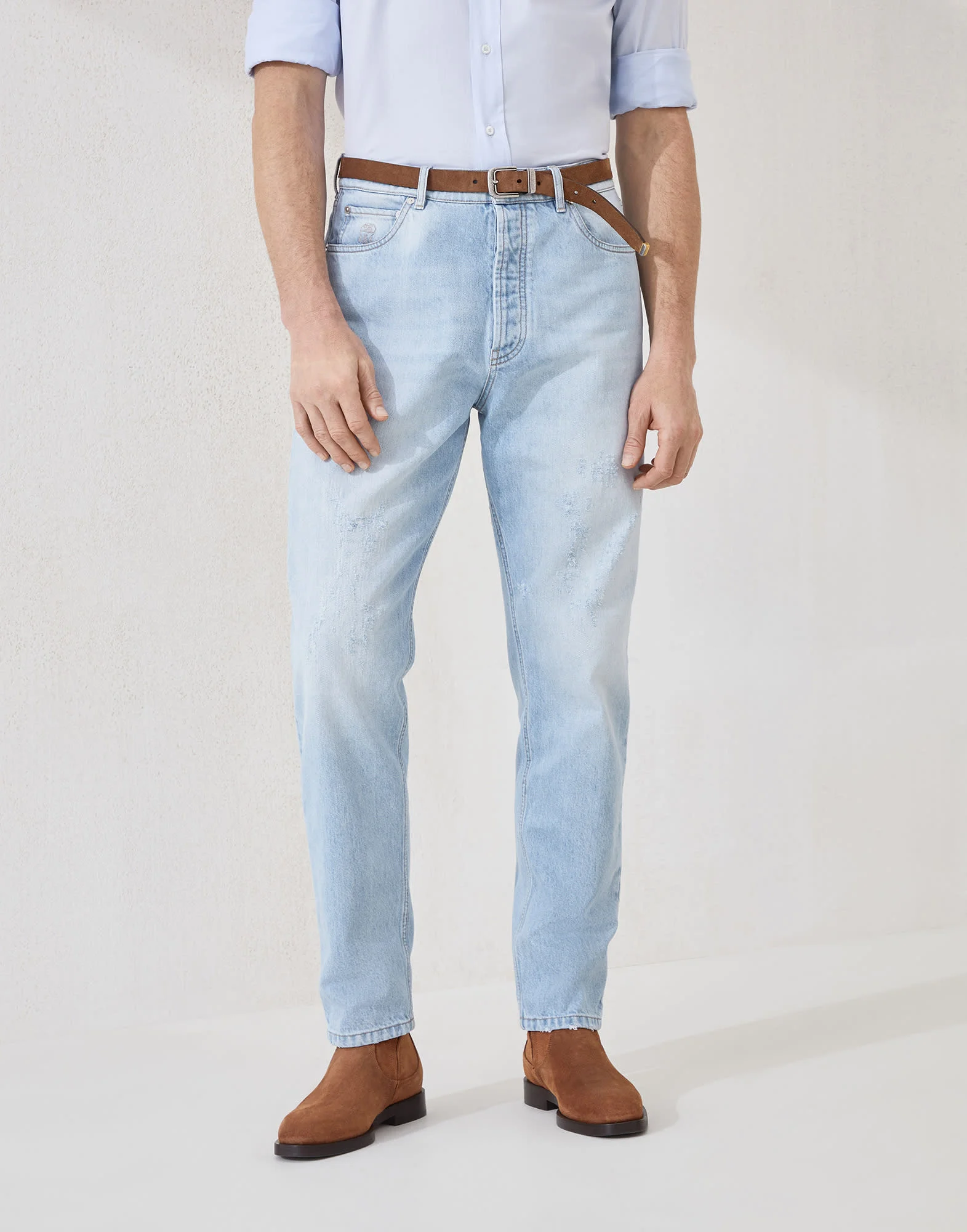 Refined yarns and artisanal workmanship elevate the casual attitude of these iconic fit five-pocket trousers, made from pure cotton denim. The natural fibers give the fabric a smooth, substantial texture, brought to life by the distinctive rip details. The silhouette offers a slightly high-waisted cut, which then falls regularly down the leg. MATERIALS Fine Japanese denim is a pure cotton fabric weighing 13 oz. It features the typical full-bodied effect and durability of this type of material. DETAILS Metal button closure Front pockets with watch pocket Back patch pockets Plain hem Iconic fit: the fit is characterized by slightly high-rise proportions with a regular design along the leg 100% COTTON