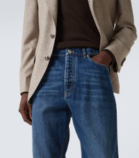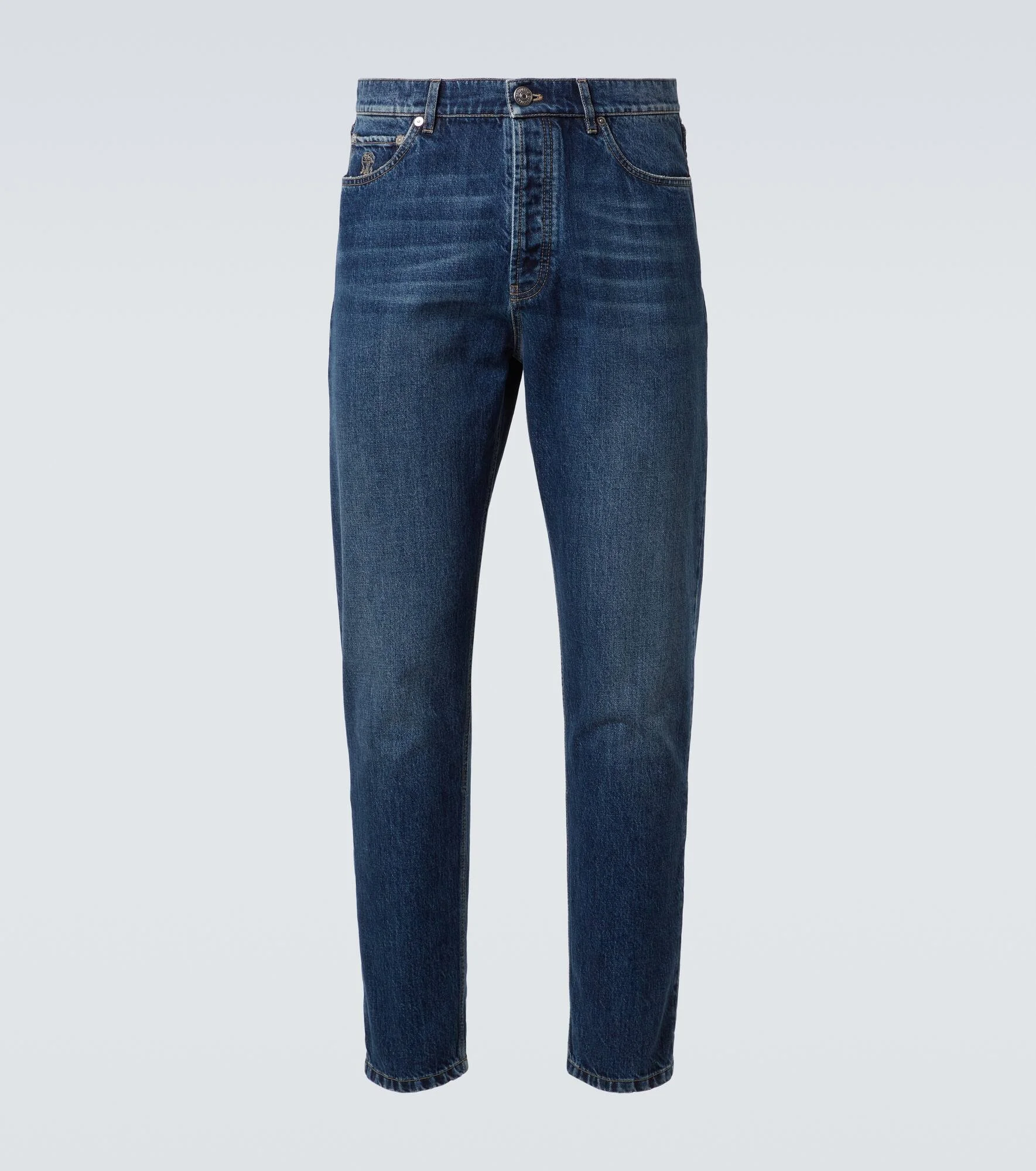 Crafted in Italy, these slim jeans feature a mid-rise style. Brunello Cucinelli's designs are created in Solomeo, a medieval hamlet whose art and traditions are woven into the house's every fiber. Product Details - Material: 100% cotton - Care instructions: dry clean - Made in Italy - Designer color name: Denim Medium - Item color: blue - Details: 100% calf leather - Item number: P01056071 Size & Fit - True to size - Non-stretchy fabric - Slim-leg - Mid-rise - The model in the picture is 185cm-6'1" and wearing a size 50