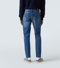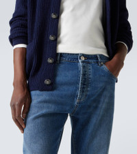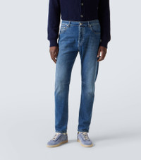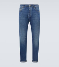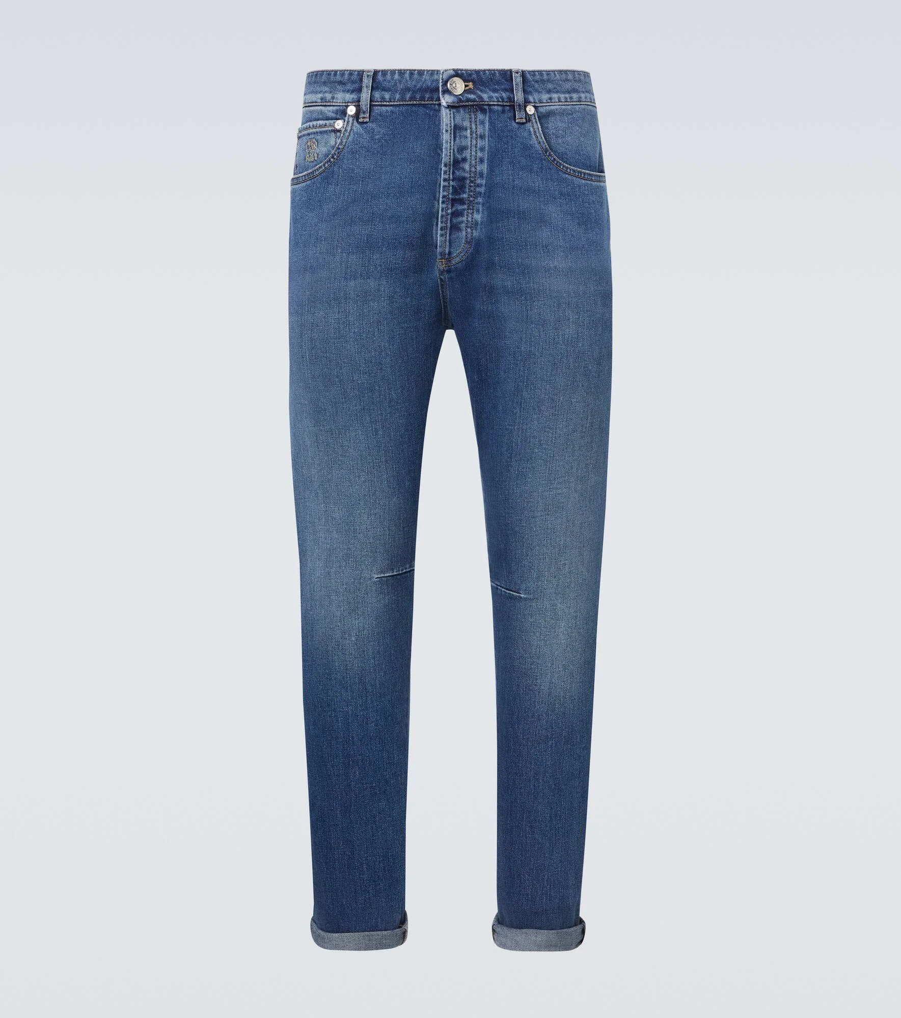 Brunello Cucinelli's designs are created in Solomeo, a medieval hamlet whose art and traditions are woven into the house's every fiber. These jeans are Italian-crafted into a mid-rise, slim-leg silhouette with up-turned cuffs. Product Details - Material: 98% cotton, 2% elastane - Care instructions: machine wash cold - Made in Italy - Designer color name: C1471 - Item color: blue - Closure: zip and button fastening - Pockets: five pockets - Belt loops - Item number: P01056072 Size & Fit - True to size - Non-stretchy fabric - Slim-leg - Mid-rise - Height of model is 189cm-74.5" and wears a size 50