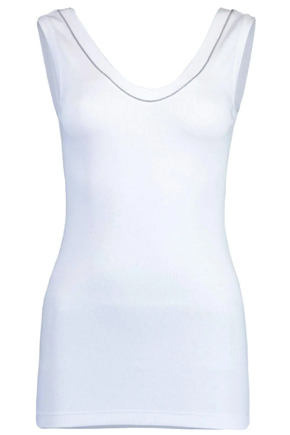 DETAILS AND INSIGHT Brunello Cucinelli white sleeveless V-neck tank top with monili detail long the neckline and a slim fit. 94% Cotton, 6% Elastane Dry Clean Made in Italy Style M0TC8BJ312-C159
